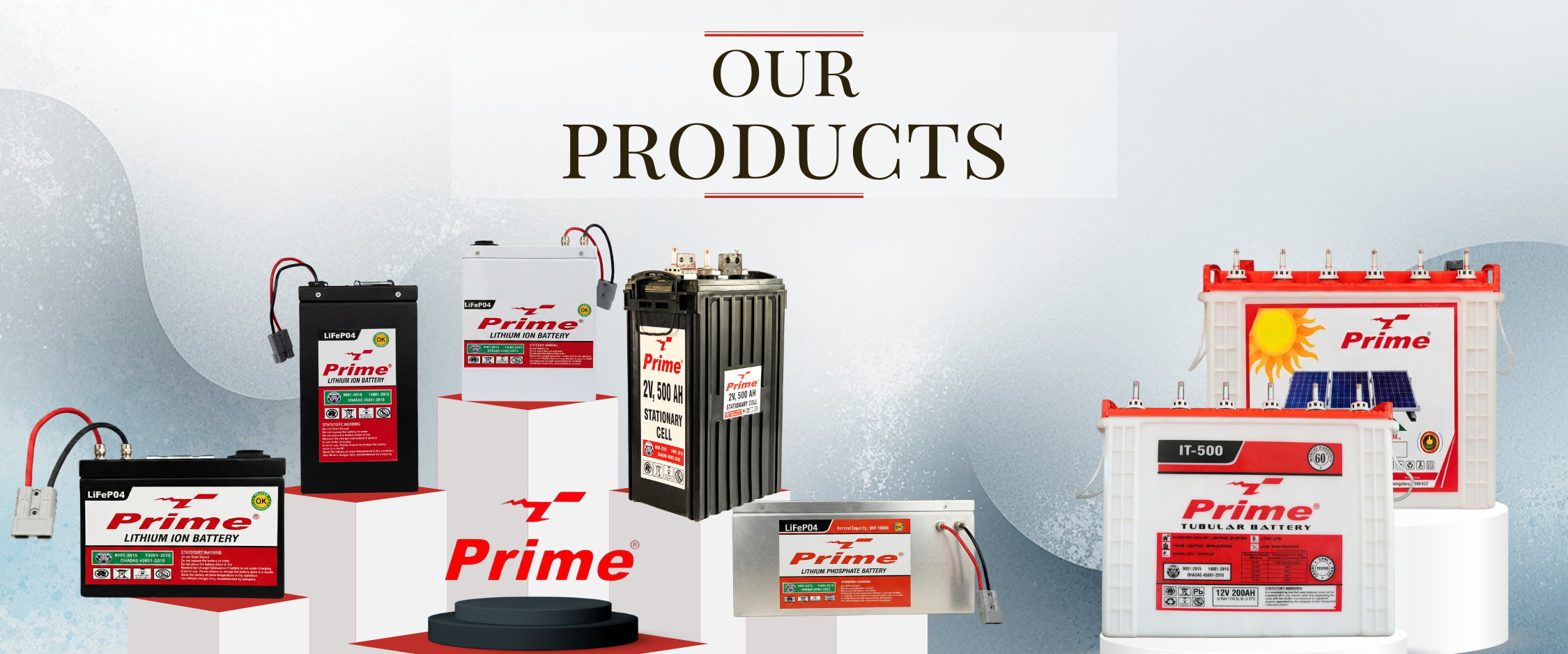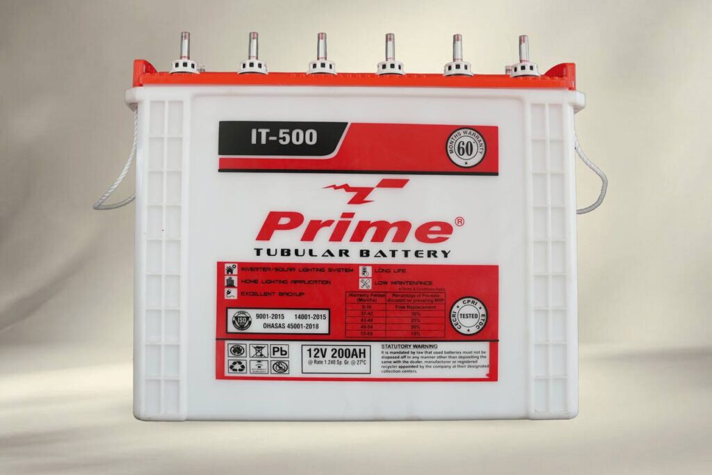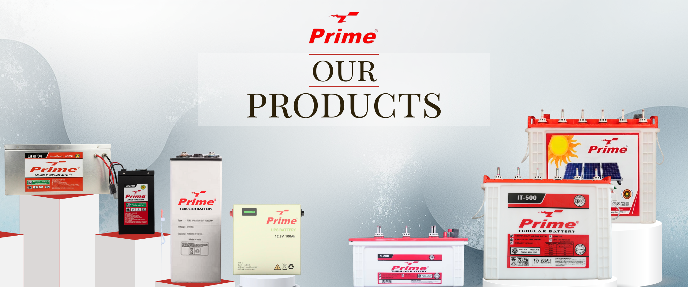 Prime Tech offers a wide range of batteries including tubular batteries, inverter batteries, solar tubular batteries, industrial tubular batteries, 2V stationary batteries, and advanced LiFePO₄ (Lithium Iron Phosphate) batteries.